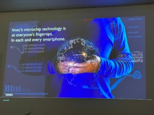 De volgende stop was Imec, wereldwijd erkend als R&D-hub voor nano- en digitale technologie. De deelnemers kregen een inkijk in de Imec wereld waar de doelstelling is: chips elke twee jaar krachtiger maken, waar atomen worden ‘ingeschoten’ in halfgeleiders, en waar nanometerprecisie dagelijkse realiteit is.