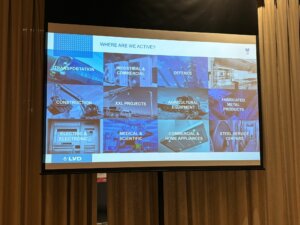 Tijdens de centrale bedrijfspresentatie gaf Kurt Debbaut (Sales Director LVD) een overzicht van LVD’s geschiedenis en wereldwijde positie. Het bedrijf, in 1952 ontstaan vanuit de vlasindustrie, is inmiddels actief in 47 landen en bedient een breed scala aan sectoren.